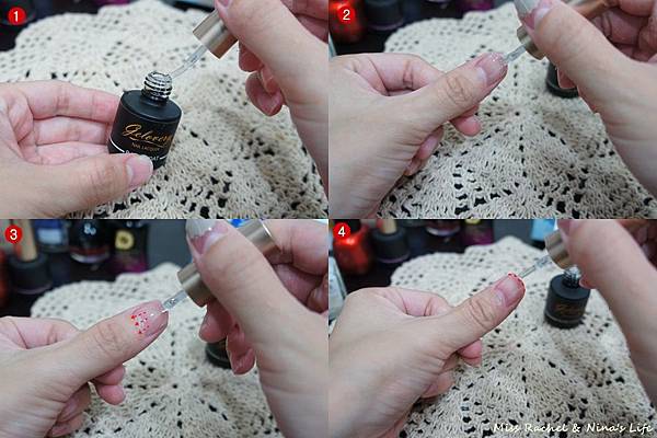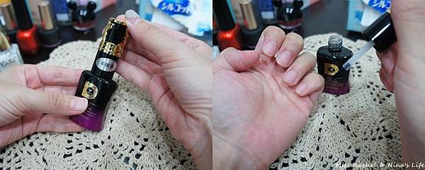 所以建議可以一開始先在瓶口將稍微掃一下多餘的底膠,再將底膠沾在指甲的中央位置,然後輕輕地、慢慢地往指緣方向推擦,最後指甲前端要記得包邊!!