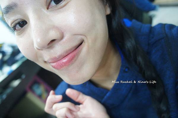 剛擦上去的時候有點涼涼的薄荷感,夏天用的話應該會覺得頗清涼舒服,一下下後清涼感消失,就像嘴上有一層薄膜,滋潤度很不錯,水潤清透又不會黏黏的。