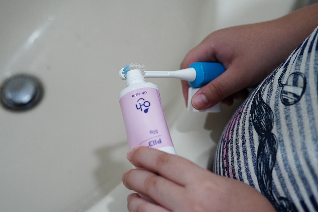 喊完oh Care,第一步就是拿出兒童牙膏來刷牙,P113⁺減少引起蛀牙細菌,