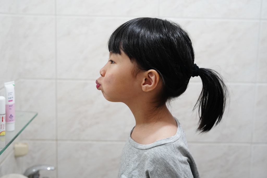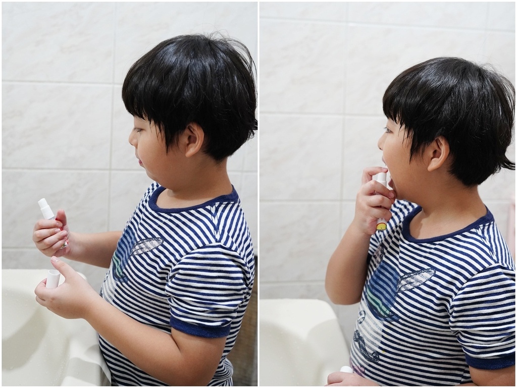 最後把這瓶小小的兒童口腔噴霧,對準口腔噴個2-3下,就完成口腔照護三部曲囉!!